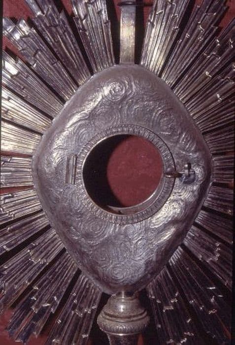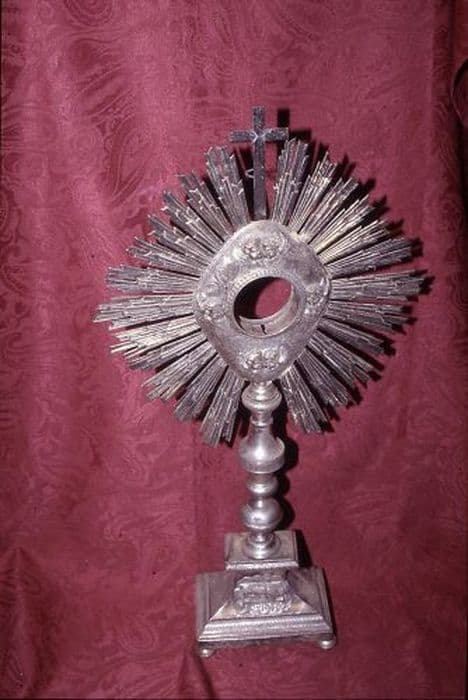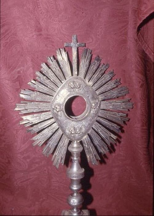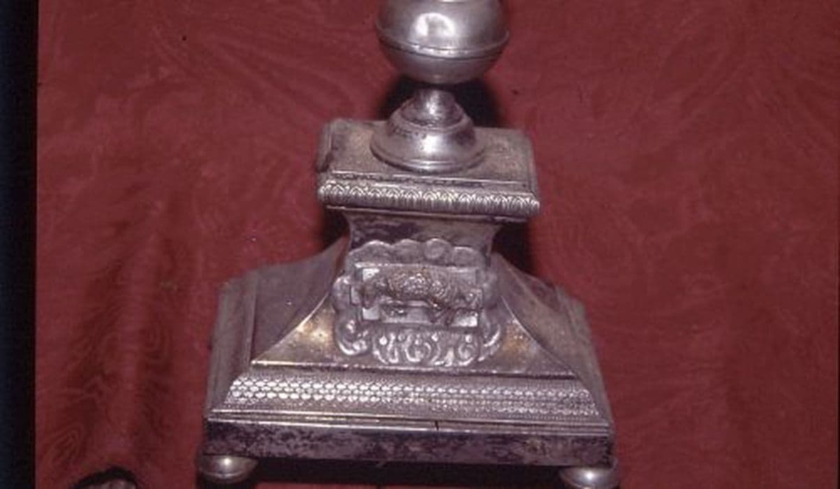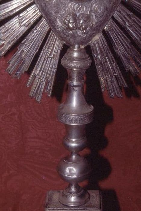 Base parallélépipédique lisse surmontée d’un redent concave ornés de stalactites. Dessus trapézoïdal incurvé chargé d’un motif : Agneau couché sur une croix posée sur un autel, le tout rayonnant de nuées. Base du fut parallélépipède à décors nébuleux. Collerette basse en forme de boule lisse. Noeud en forme d’urne gravée sur le bandeau supérieur de feuilles d’eau. Collerette haute à décor nébuleux. Monstrance circulaire dorée entourée de nuées chargées de têtes d’angelots : deux en pointe et en chef, un de part et d’autre. Gloire à rayons droits. Croix latine simple.