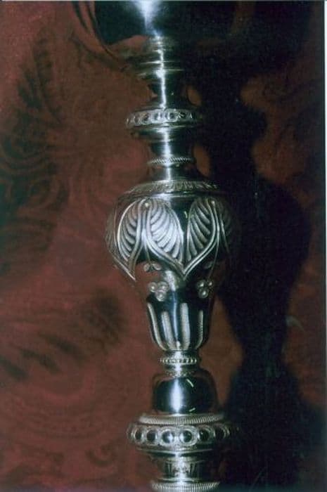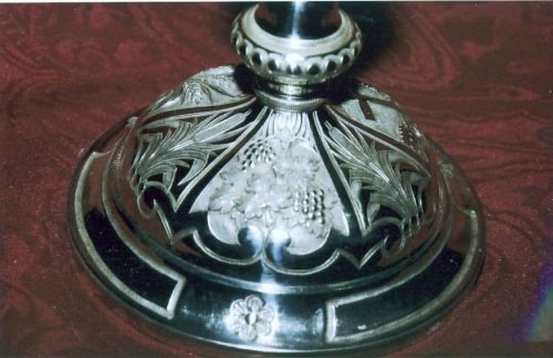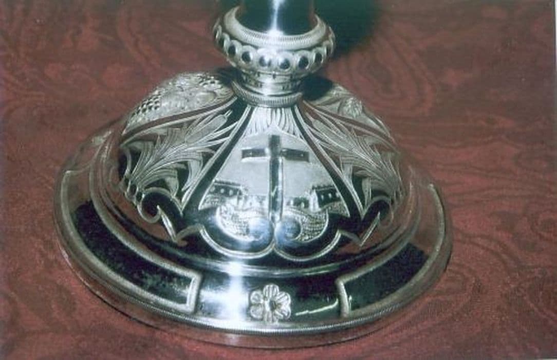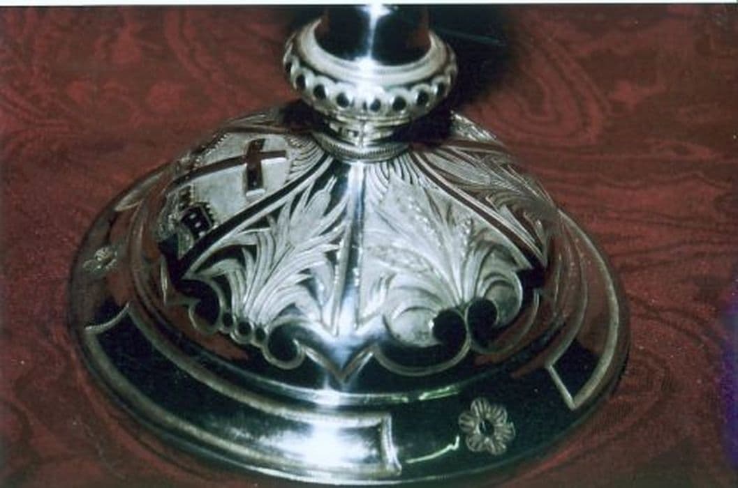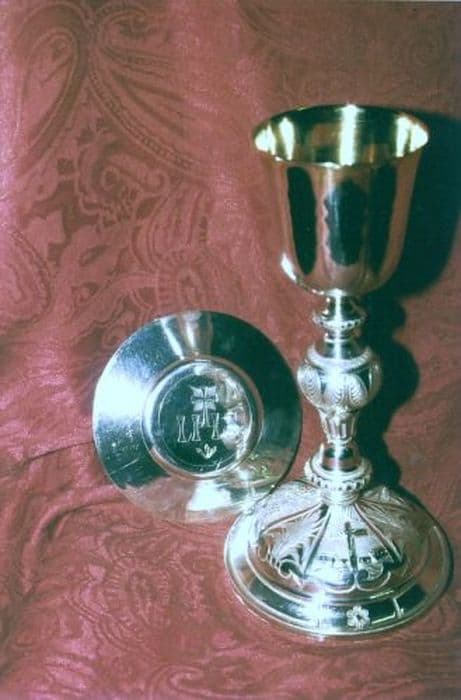Calice en argent, et coupe en argent doré, accompagné d'une patène en argent doré. Pied circulaire lisse à redent concave chargé de trois cartouches vides séparés par trois rosaces à six pétales. Collerettes basse et haute perlées. Fine collerette perlée. Noeud ovoïde allongé, à larges cannelures à la base et feuilles stylisées d’où émergent un pistil au sommet. Coupe évasée.