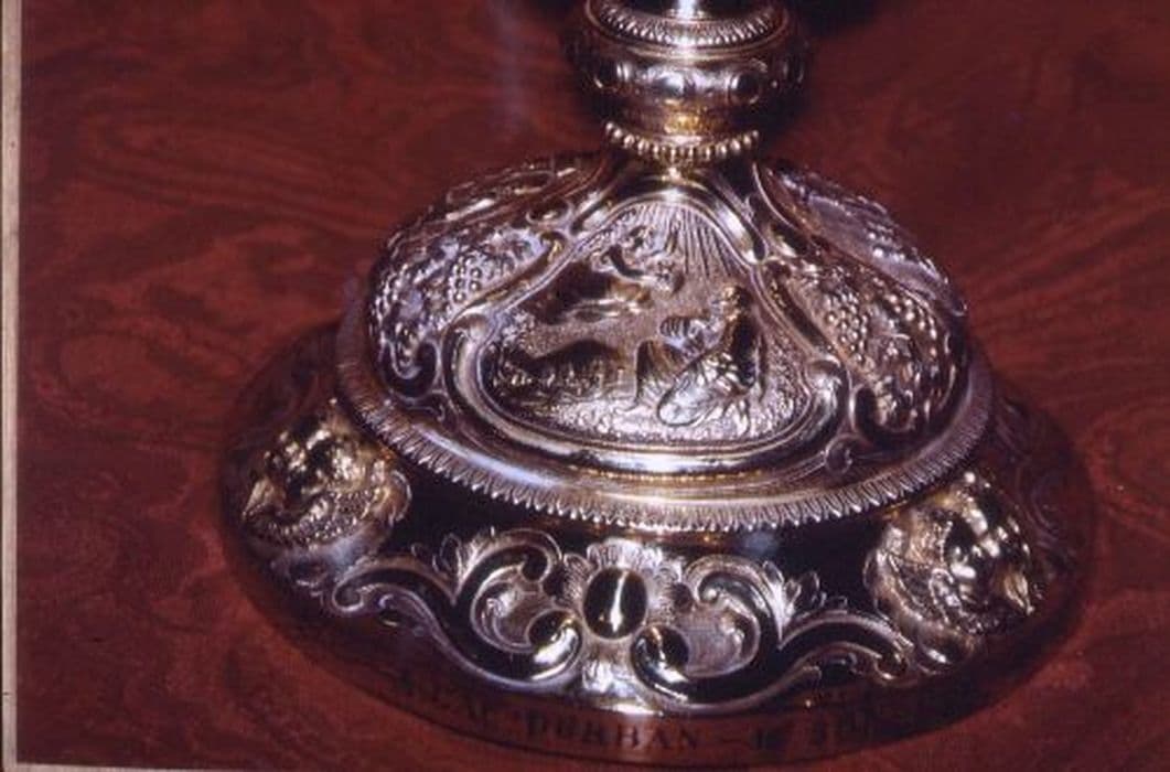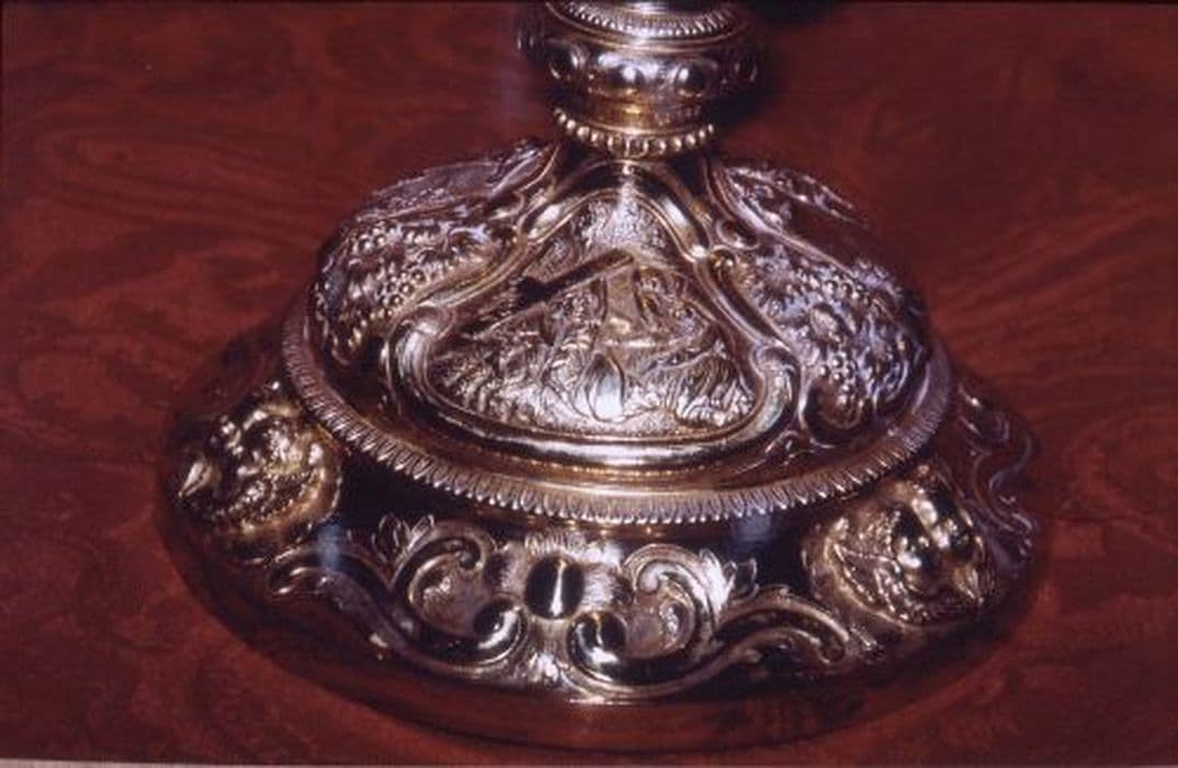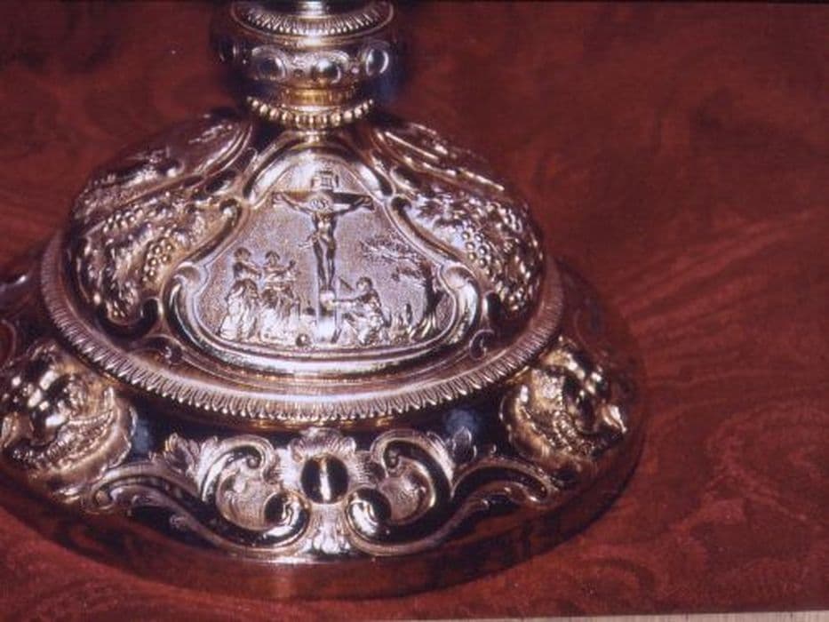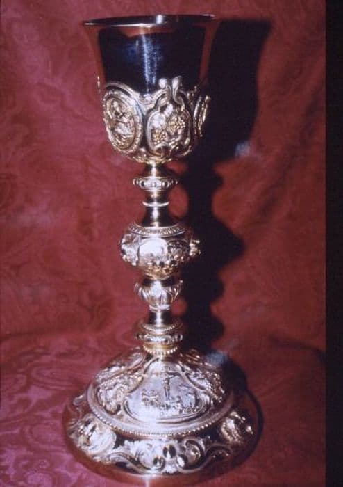 Calice et patène en argent doré. Pied circulaire décoré de trois rinceaux autour d’un opercule alternant avec deux têtes d’anges dans un cercle. Dessus très bombé et très fine collerette perlée. Collerettes basse et haute à perles gravées. Noeud en forme d’urne à côtes de melon à la base et trois têtes d’anges sur un décor de roses au sommet. Très fine collerette perlée. Coupe lisse à bord légèrement évasé. Patène en argent doré.