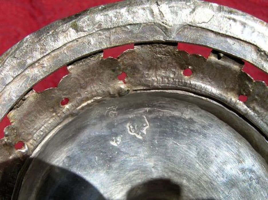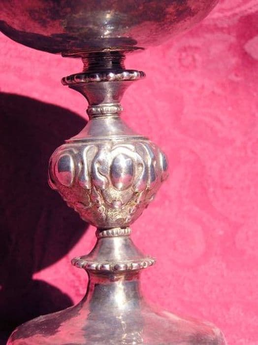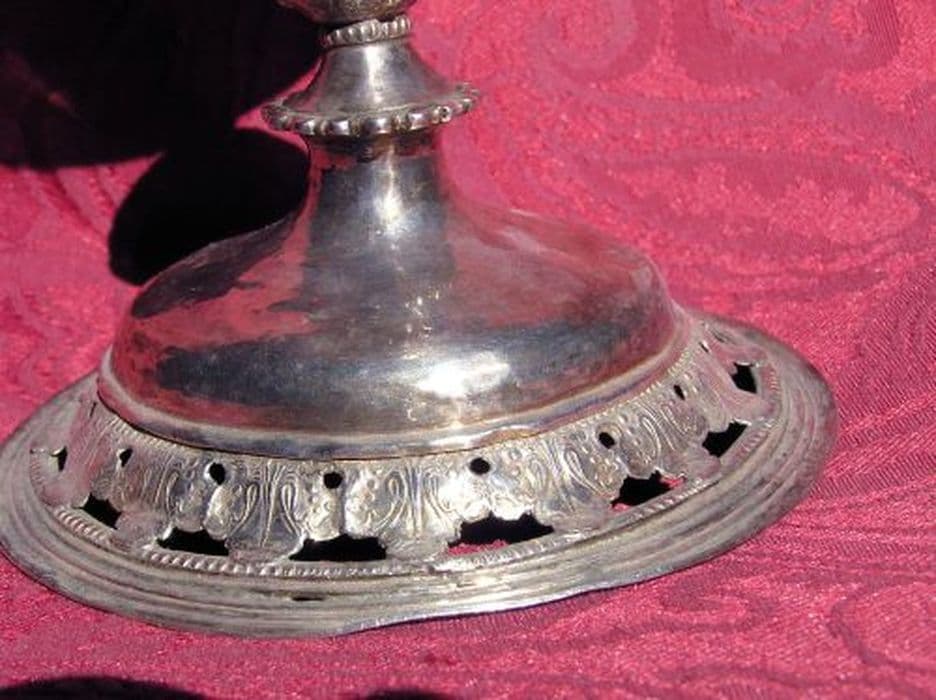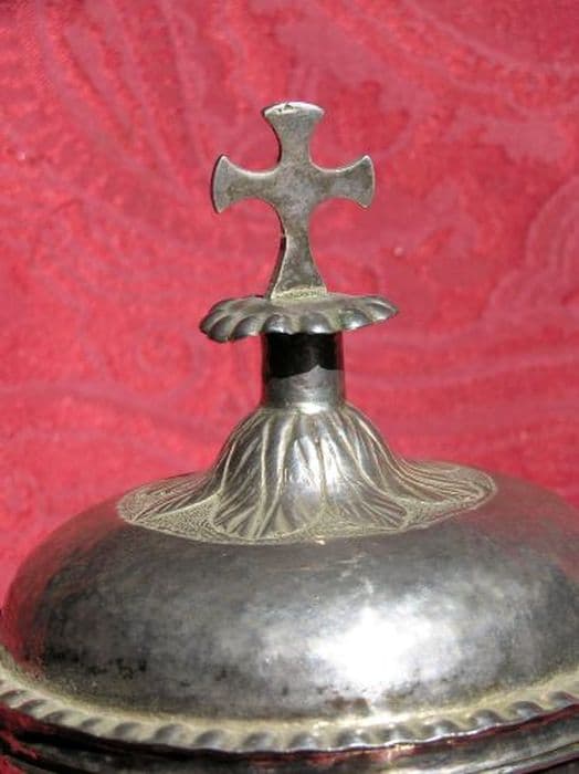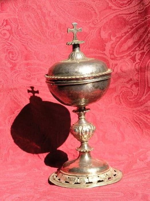 Ciboire en argent, doré à l'intérieur de la cuve. Pied circulaire à feuilles d’acanthe ajourées, soulignées par une frise fine de petits godrons. Dessus bombé lisse. Collerettes basse et haute à perles plates espacées. Noeud piriforme à cabochons sur fond végétal. Cuve hémisphérique lisse. Couvercle à bordure ondée, décoré en coeur de feuilles, le tout surmonté d’une collerette ondée. Croix grecque sommitale pattée.