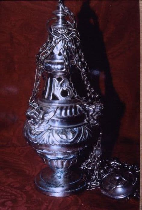 Encensoir en métal argenté sur pied circulaire. Base de la cuve à côtes de melon. Partie haute décorée de motifs végétaux réguliers et de trois têtes d’anges rapportées. Cheminée à côtes de melon en biais surmontée d’une partie ajourée terminée par une frise emboutie de grosses perles. Chapeau feuillagé surmonté d’une couronne à côtes de melon sommé par un bouton.