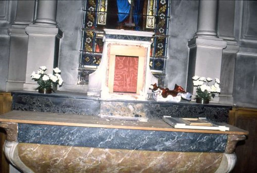 Autel de forme gondole en marbre caramel veiné de blanc souligné à la base et à la partie haute de marbre noir veiné de blanc et aux angles en marbre blanc mouluré au pied et à la tête en marbre caramel. Gradin en marbre caramel avec bordure en marbre noir veiné.