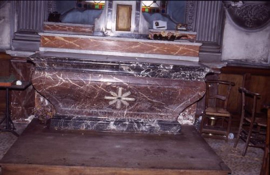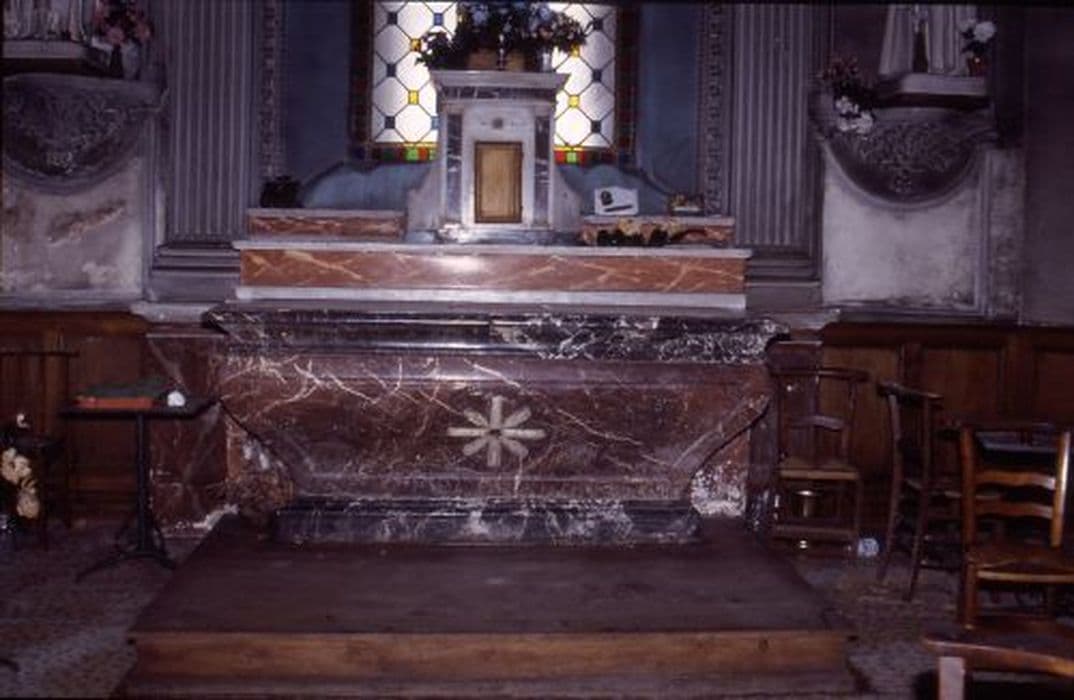 Autel de forme gondole en marbre rouge veiné de blanc. Base et bordure haute en marbre gris veiné de blanc. Cartouche central circulaire chargé d’une marguerite à huit pétales en marbre blanc, au coeur en marbre noir veiné de blanc. Prédelle en marbre caramel veiné de blanc. Tabernacle en marbre blanc à appliques en marbre gris foncé veiné de blanc.