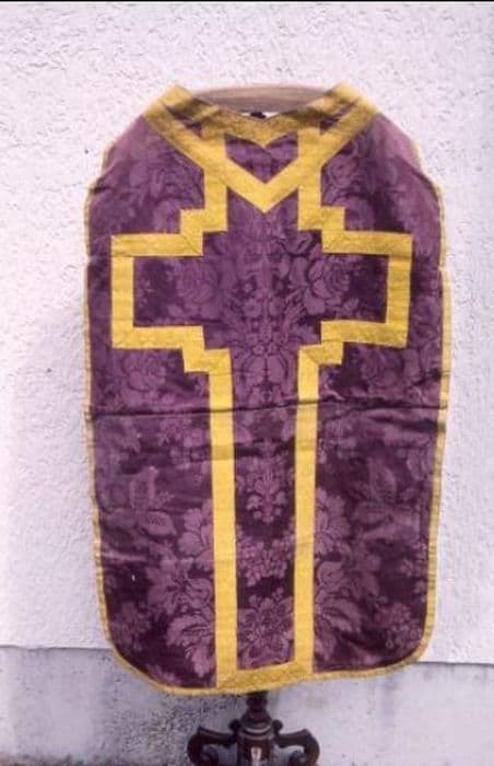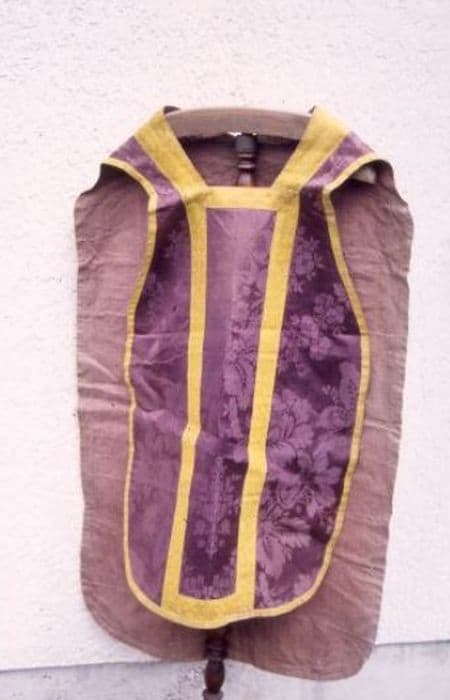 Chasuble et manipule en damas violet et doublure cramoisi. Orfrois et croix de la chasuble dessinés par passementerie droite à figures géométriques à huit cotés en coton jaune doré. Ornement et franges en coton jaune doré sur le manipule.