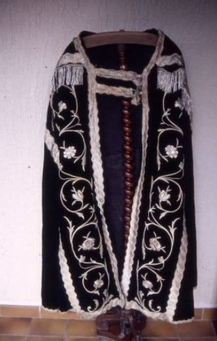 Chape en velours bleu profond et passementerie ornée de feuilles de chêne d’argent. Doublure noire.