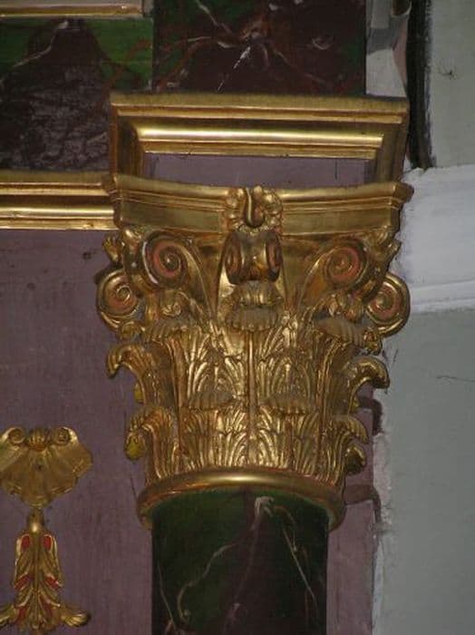 Retable à deux colonnes de marbre noir veiné de rouge à chapiteaux corinthiens dorés soutenant un entablement imitant du marbre noir veiné de rouge sommé d'un fronton en chapeau de gendarme très prononcé en bois doré.