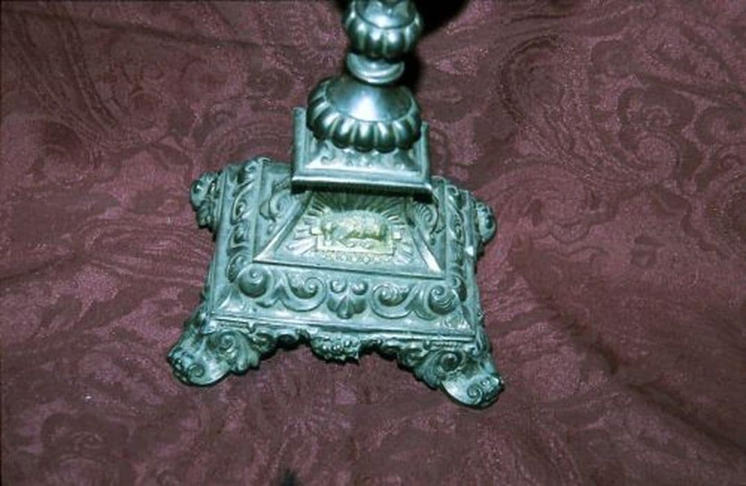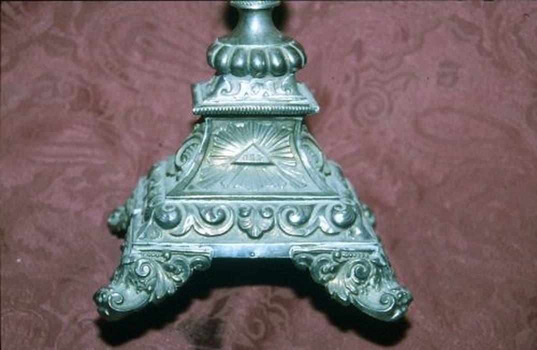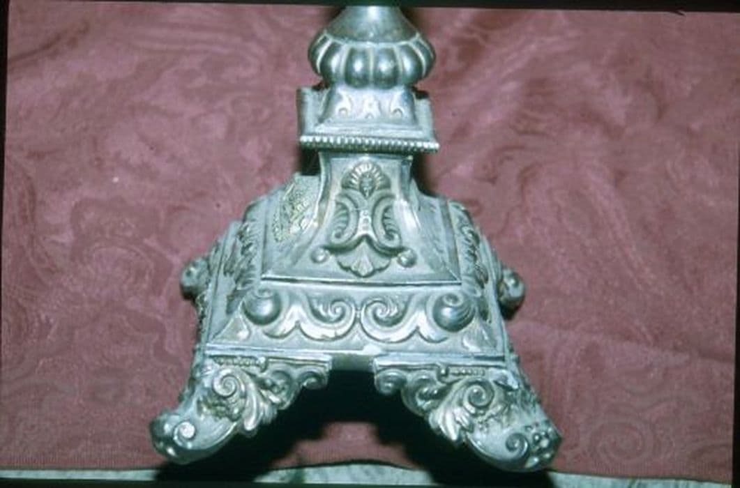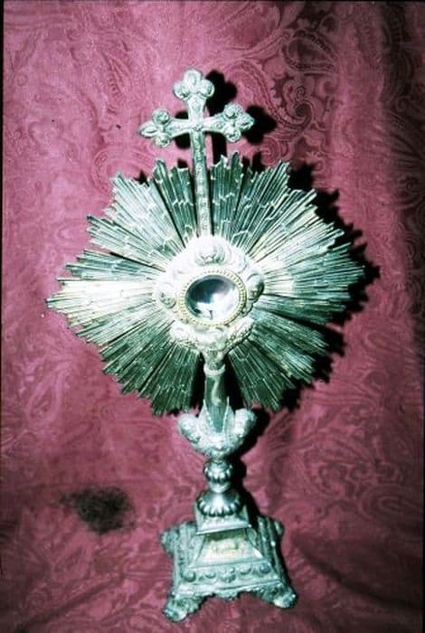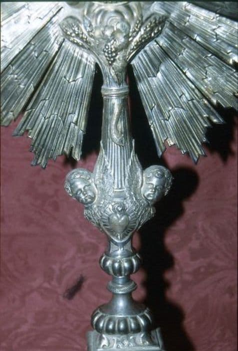 Ostensoir en argent sur pied à volutes. Base rectangulaire décorée d'une coquille stylisée entourée de rinceaux. Dessus pyramidal tronqué. Table bordée de perles sommée d'un motif à côtes de melon. Collerette basse striée en biais. Noeud en forme d'urne frappée d'un coeur enflammé rayonnant de face et des Tables de la Loi rayonnantes de dos, le tout encadré de deux têtes d'ange frisées. Fût cannelé frappé de deux gerbes de blé attachées par un anneau. Monstrance perlée dorée entourée de nuées chargées de deux têtes d'anges au sommet et d'une de part et d'autre. Gloire à rayons droits. Croix en fleur de lys ouvragée.