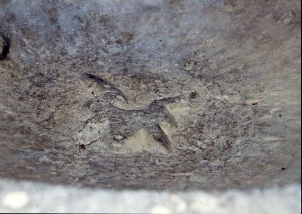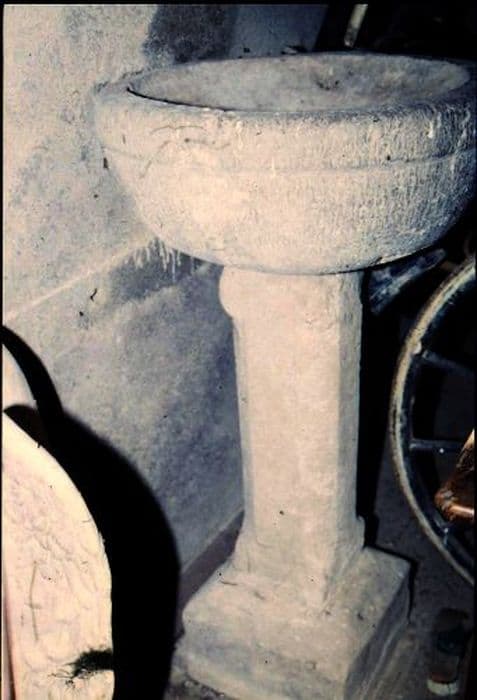 Bénitier en pierre avec inclusion d'une sculpture de grenouille au fond de la cuve.