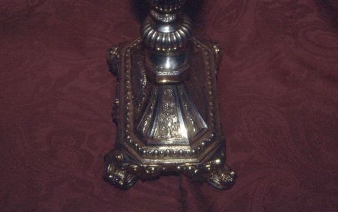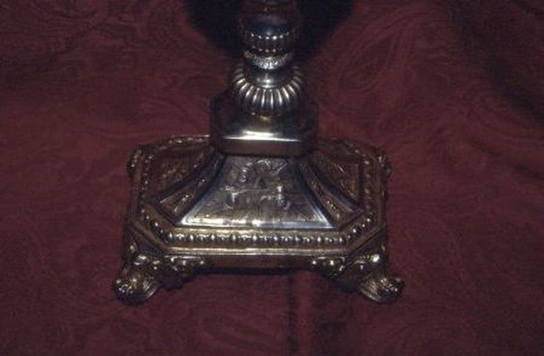 Ostensoir en argent doré sur pied à volutes reliées par un décor végétal avec une coquille centrale. Dessus pyramidal tronqué à coins coupés souligné par une frise perlée. Grosse collerette godronnée à la partie basse. Fine collerette. Noeud en forme d’urne à godrons sur la partie basse, gravé sur la partie haute, cantonnée de têtes d’anges. Fût cannelé terminé en bouquet d’épis de blé et de grappes. Monstrance perlée entourée de nuées chargées de quatre têtes d’anges. Gloire à rayons droits. Croix trilobée.