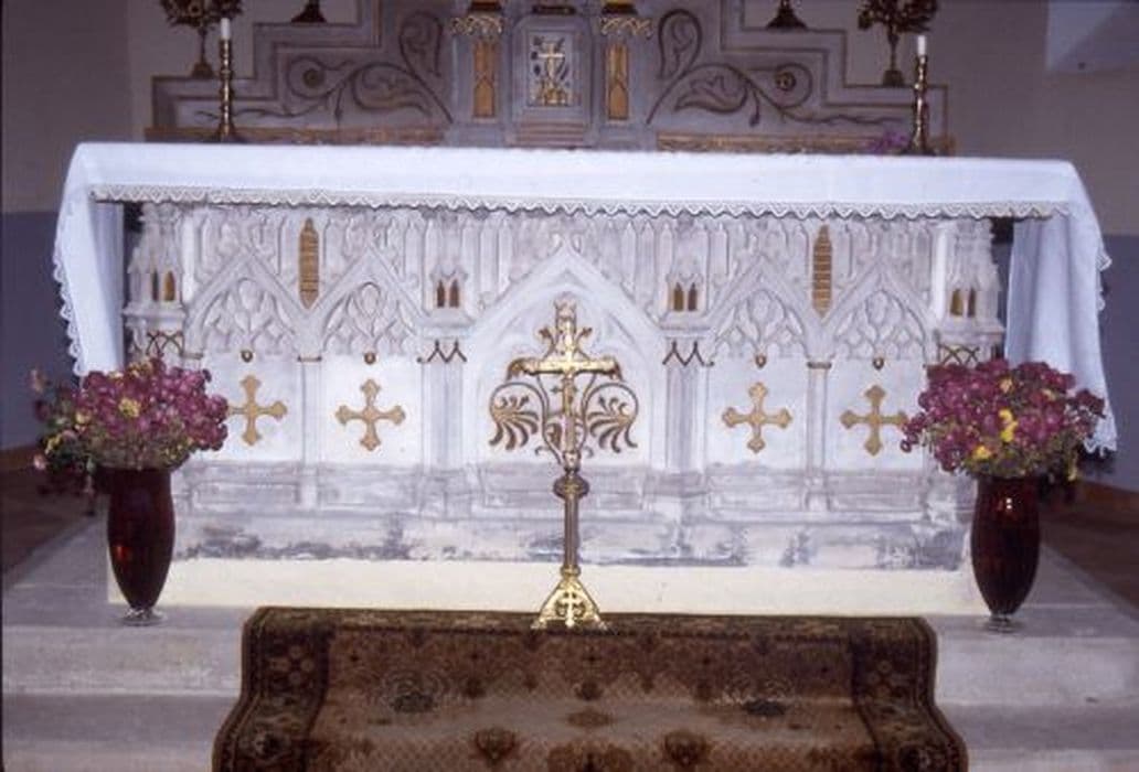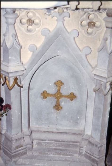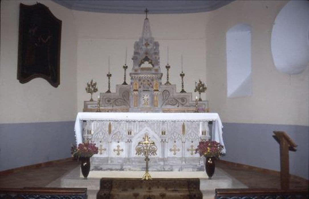 Autel néo-gothique en pierre à cinq enfeus frappés d’une croix grecque trilobée d’or, et angles en forme de pinacle, surmonté d'un gradin en forme d'escalier sur trois niveaux encadrant le tabernacle. Le gradin est décoré d’une frise dorée à la partie basse et de rinceaux gravés aux niveaux supérieurs. Tabernacle droit à deux colonnettes lisses sommées d’un chapiteau corinthien soutenant une voûte d’ogive.