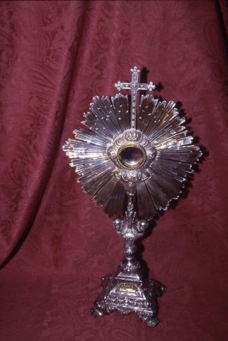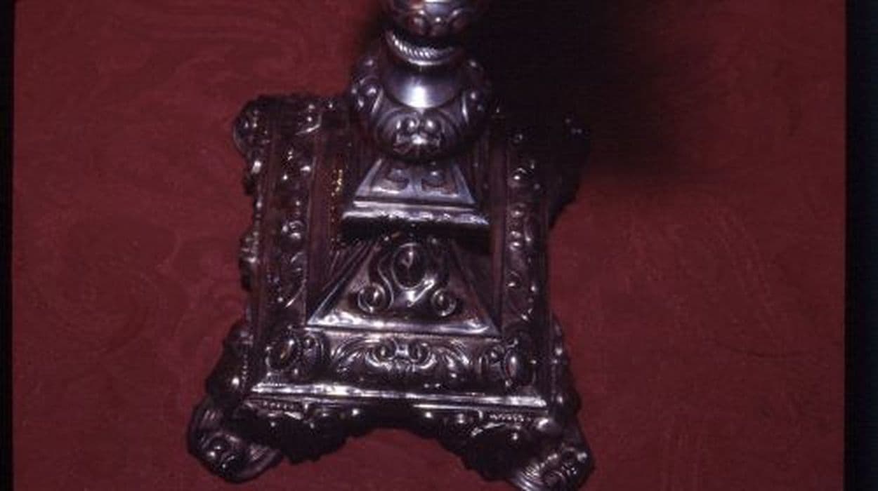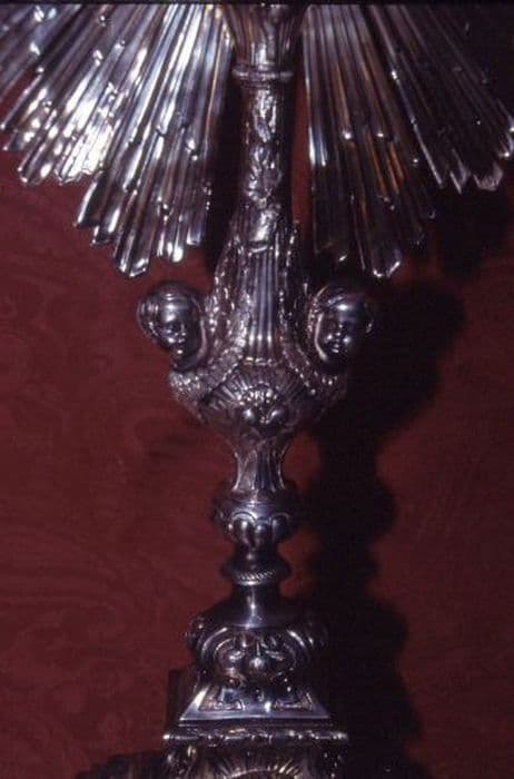 Ostensoir en argent sur pieds à volutes. Base rectangulaire ornée d’une bordure de rinceaux et d’opercules en coeur et en coins. Importante collerette basse ornée. Collerette supérieure striée en biais. Noeud en forme d’urne, godronnée à la partie basse. Fût cannelé terminé en gerbe de blé. Gloire à rayons droits. Croix latine trilobée.