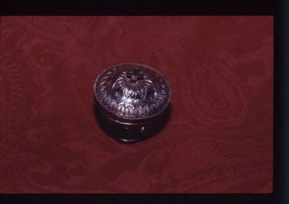 Ciboire des malades sur pied circulaire lisse, dit pyxide. Couvercle bordé de feuilles stylisées, coeur rayonnant de feuilles. Petite croix.