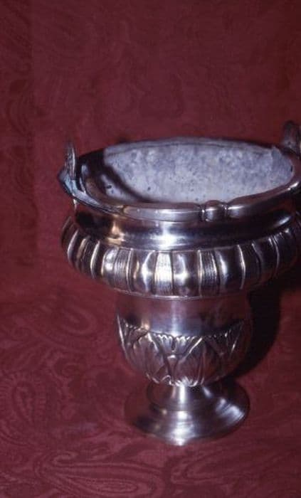 Cuve à aspersion en métal argenté. Base circulaire lisse. Cuve en forme d’urne décorée de larges feuilles à la base et large collerette de grosses barres à la partie haute. Poignée travaillée.