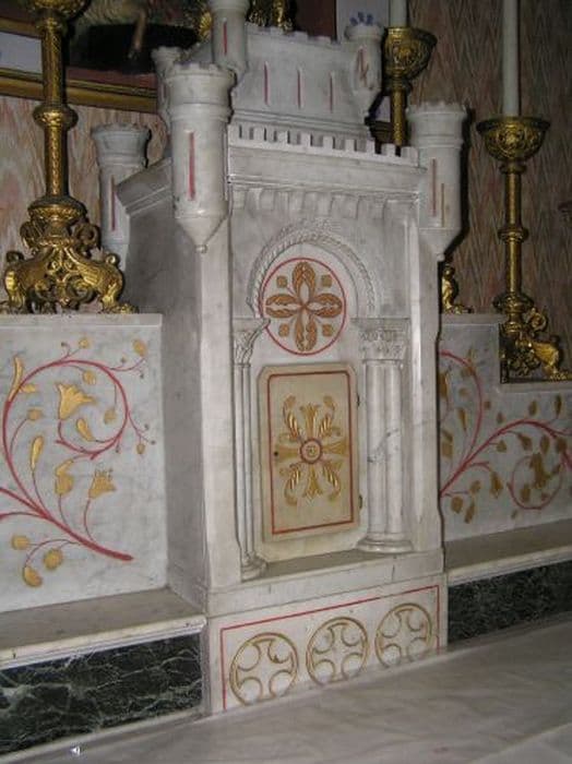 Tabernacle en marbre blanc sur l'autel de la chapelle Sainte-Germaine (PM09002582), sommé de tourelles. La façade à arc triomphal est décorée d’une rosace gravée dorée soutenu par des colonnettes à chapiteaux corinthiens.
