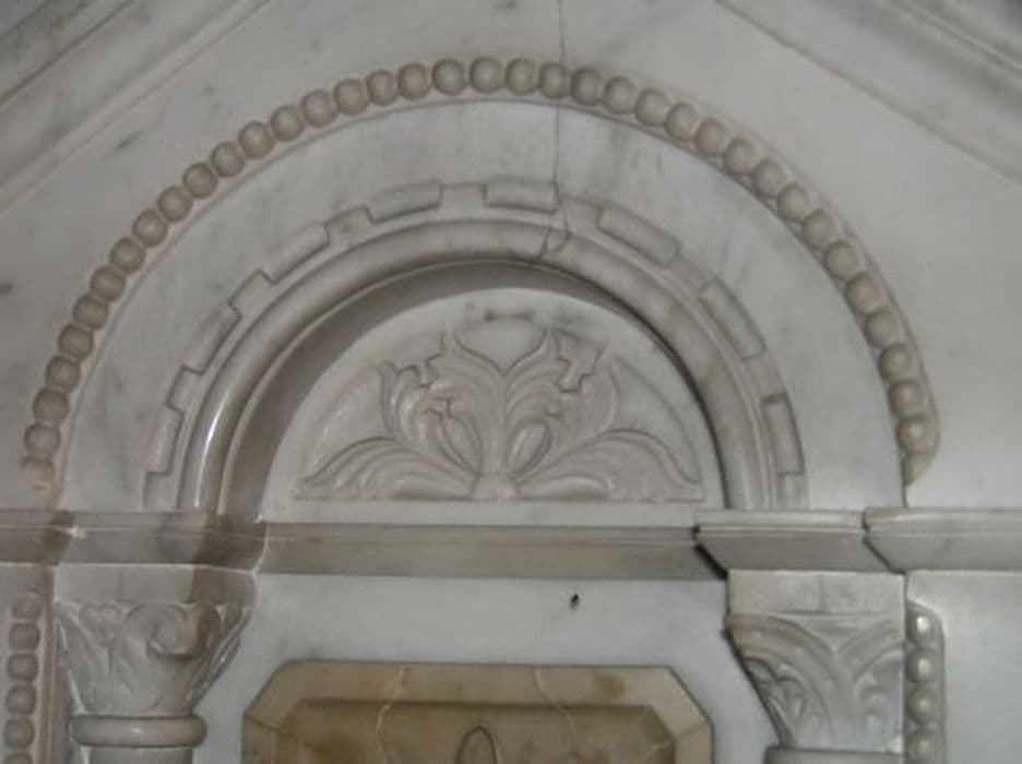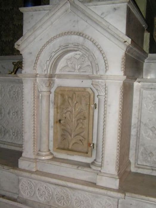 Tabernacle en marbre blanc à fronton triangulaire, façade à arc triomphal soutenu par des colonnettes à chapiteau dorique décoré au dessus d’une porte ornée d’une tige de lys fleuri.