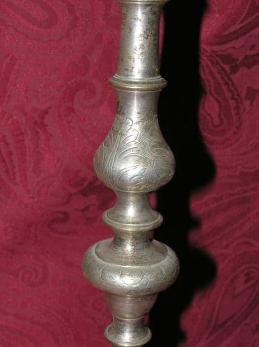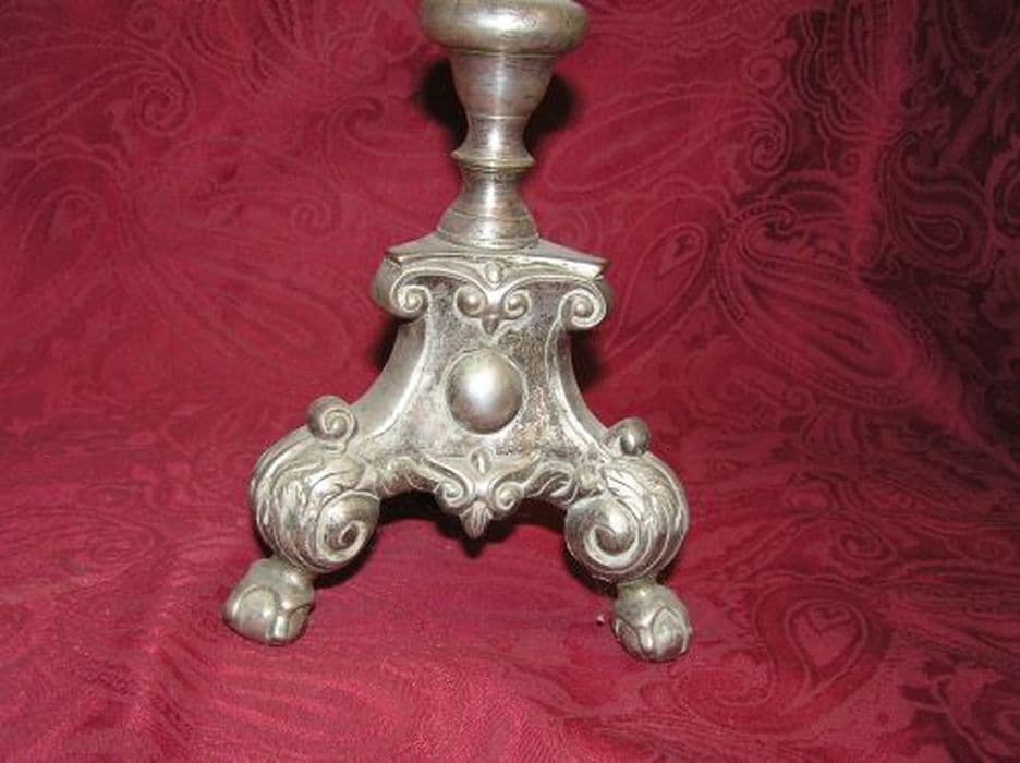 Deux chandeliers d'autel gravés de feuillages, en bronze argenté. Trois pattes posées sur une boule. Base pyramidale incurvée. Décor du pied et du sommet en volute et opercule en coeur. Fût circulaire à feuillages gravés. Large coupelle. Bobèche allongée.