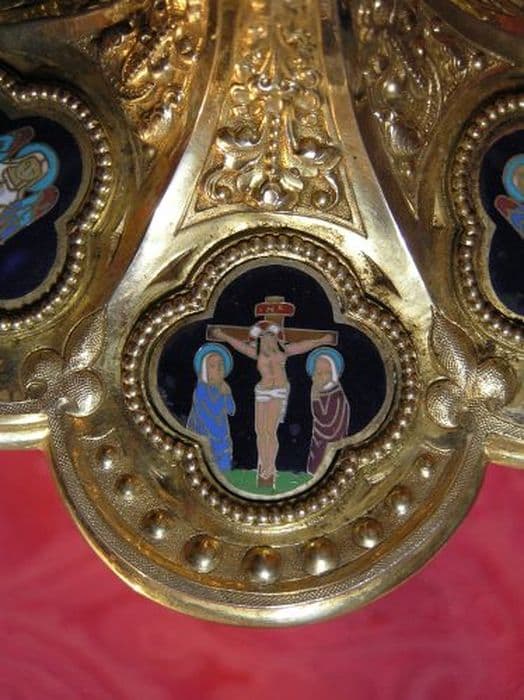 Calice néo-gothique en argent doré avec patène. Pied sextilobe à la bordure décorée d'une ligne brisée. Dessus portant six médaillons en émail à fond bleu très foncé, dans un quadrilobe perlé. Base en pyramide tronquée à six pans décorée de motifs végétaux stylisés. Collerette basse et haute à six pans à plusieurs ressauts. Fût hexagonal orné de végétaux stylisés. Noeud à boutons entourés de perles, chargé d'une croix et des lettres JESUS en émail rouge sur fond bleu. Fausse coupe à trois motifs de végétaux stylisés, séparés par trois médaillons en émail sur fond bleu foncé, dans un quadrilobe perlé, entourés de rinceaux de lierres. Coupe évasée.