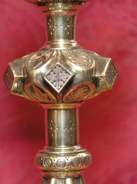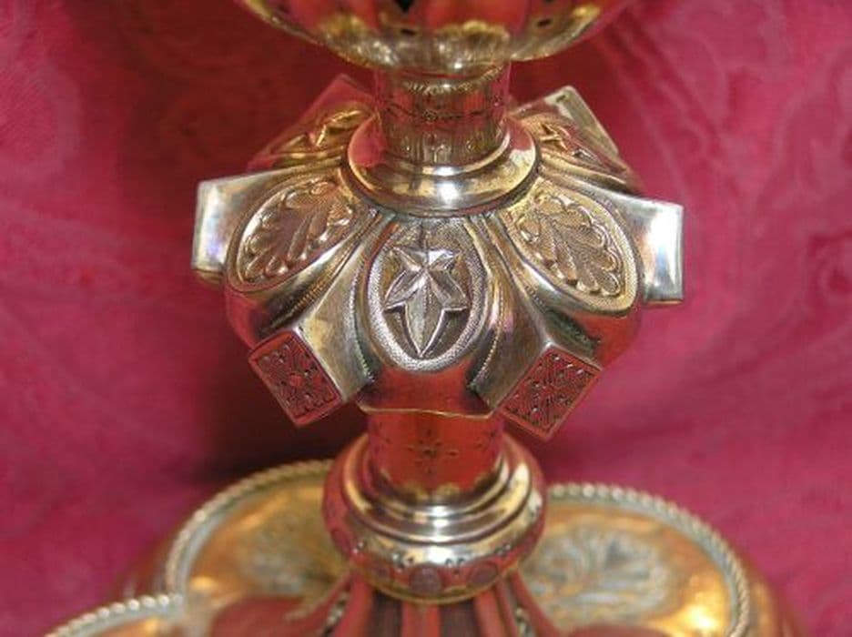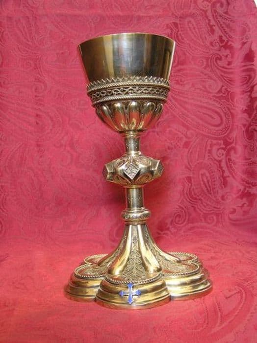 Calice néo-gothique argent doré. Pied sextilobe au redent convexe lisse chargé d’une croisette tridentée en émail bleu. Dessus à six côtes se rejoignant pour former le fût alternant avec une applique de fougère stylisée, l’ensemble souligné par une cordelette. Collerette basse circulaire décorée de petits cercles chargés d’une fleurette formée de petits points. Noeud à six bosses chargées d’une croisette dans un losange et décorées de feuilles de lierre et de feuilles stylisées. Fausse coupe ornée de longs godrons à la base surmontés d’une bande composé de deux cordonnets entrelacés entre deux cordelettes. Coupe évasée.