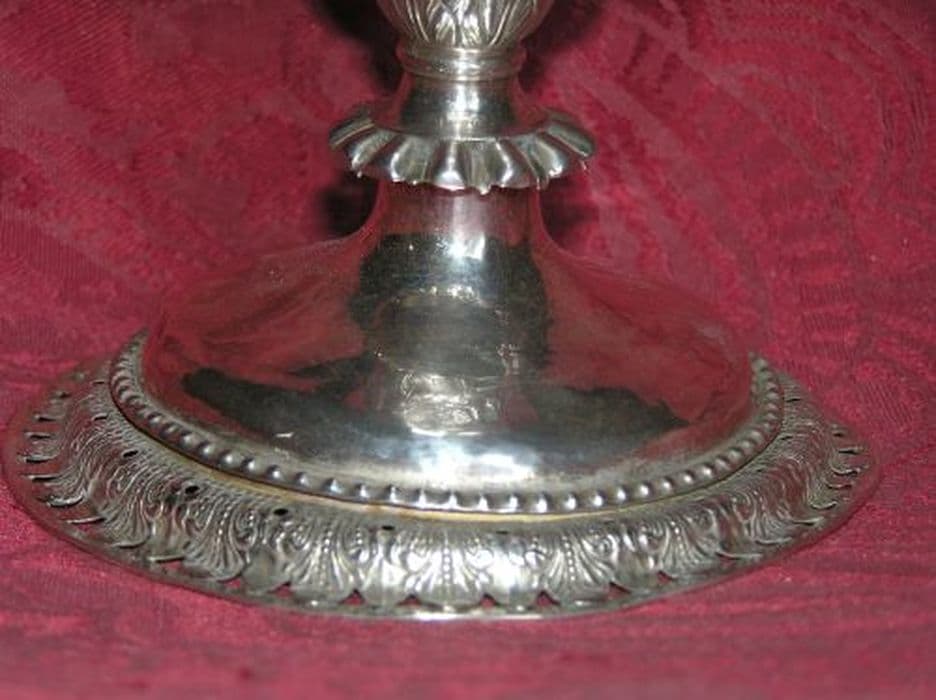Ciboire en argent, et argent doré à l'intérieur de la cuve. Pied à bordure ajourée. Dessus bombé lisse. Collerettes basse et haute ondées. Noeud orné de feuilles d’acanthe à la base et de draperies au sommet. Cuve semi hémisphérique lisse. Couvercle en chapeau de gendarme décoré de feuilles d’acanthe rayonnantes et bordé d’un filet perlé, fixation à crochets.