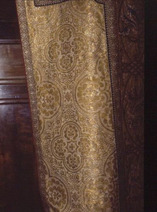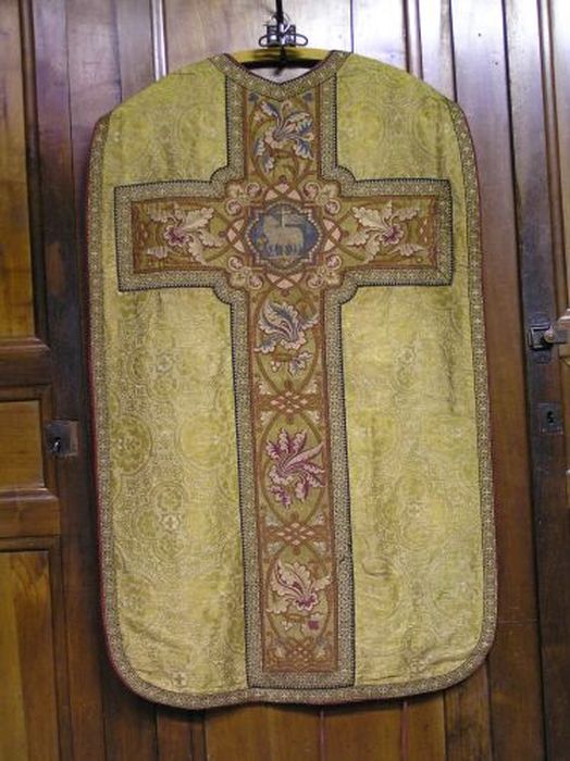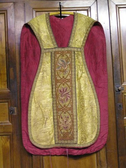 Chasuble en damas doré avec décor néo-byzantin or et rouge et doublure rouge. Orfroi et croix aux angles intérieurs arrondis dessinés par passementerie droite dorée ornée de croisettes, enserrant un drap d'or chargé de décors de feuilles d'acanthe argentées soutachées de vert et de roses au naturel, le tout dans des ovales brun rouge.