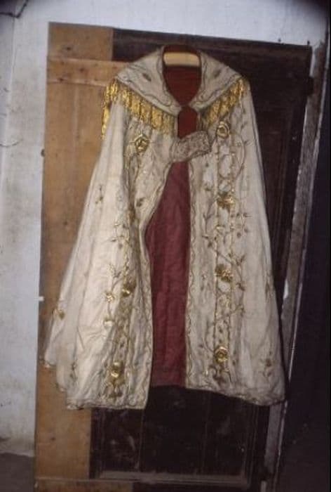 Chape en satin blanc, décorée en relief de fleurettes brodées d'or. Orfroi et dosseret brodés de rameaux fleuris et de roseaux dorés. Franges d'or. Doublure vieux rouge.