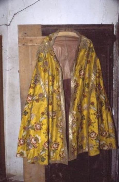 Chape en damas doré, broché de rinceaux de roses, d'épis de blé et de sarments de vigne feuillés et fruités au naturel. En coeur du chaperon, décor au masque de bouquets de roses, de liserons mauves et de fleurettes blanches soutenu par une couronne de fleurettes rouges, feuillées de vert. Passementerie droite dorée. Franges d'or. Doublure rouge foncé.