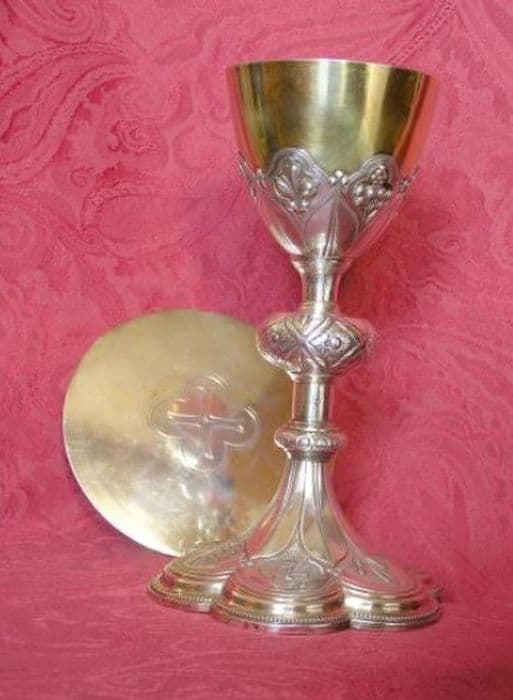 Calice et patène en métal argenté, coupe dorée intérieurement. Pied à six lobes, dessus bombé orné de six larges feuilles formant six compartiments. Collerette basse ronde lisse. Noeud plat à six losanges abritant une feuille stylisée. Fausse coupe et coupe évasée lisse.