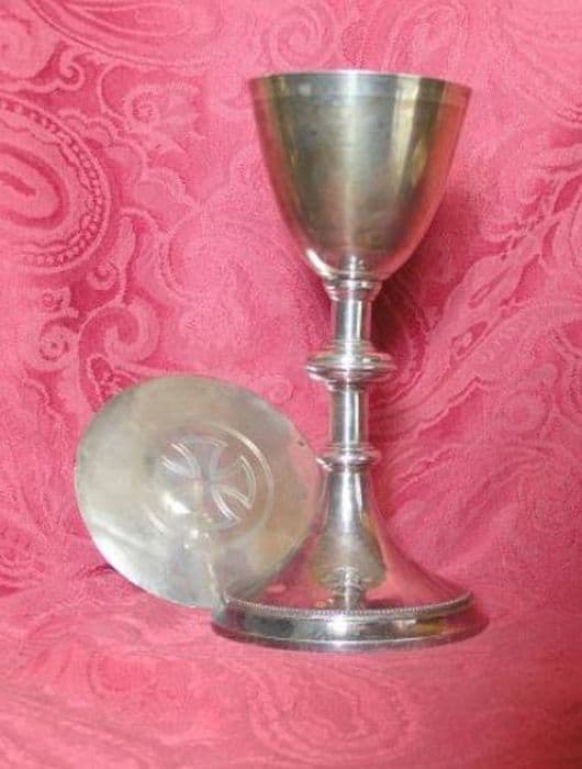 Petit calice de voyage en argent avec coupe dorée à l'intérieur et sa patène. Le calice est composé d'un pied rond à petit décor gravé, dont le dessus lisse est chargé d’une croix, d'une fine collerette inférieure lisse, d'un noeud en colleretteet d'une coupe évasée lisse.