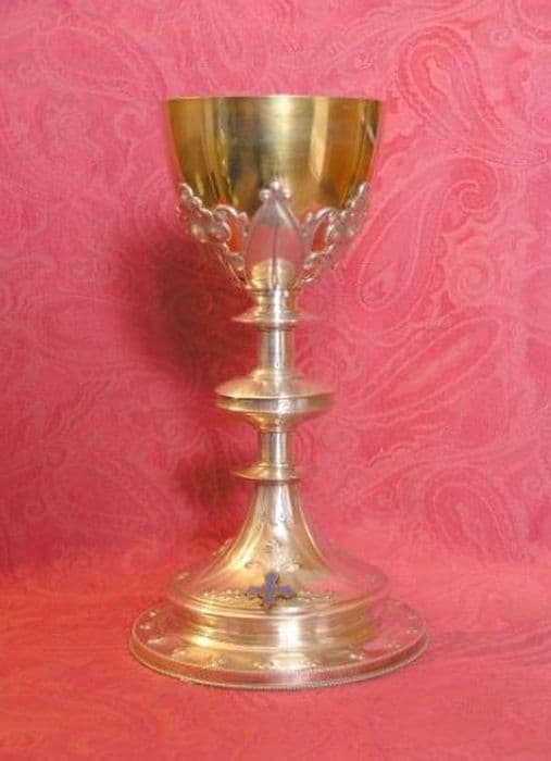 Calice en métal argenté avec coupe dorée. Pied rond à la bordure perlée surmontée d’un décor ondulé composé de trois baies, dessus bombé chargé de longues feuilles refendues et d’une croix en émail bleu. Collerette basse très mince. Noeud plat orné de gravures légères. Collerette haute très mince. Fausse coupe de feuilles refendues surmontées de trois baies séparées par des tiges florales. Coupe évasée.