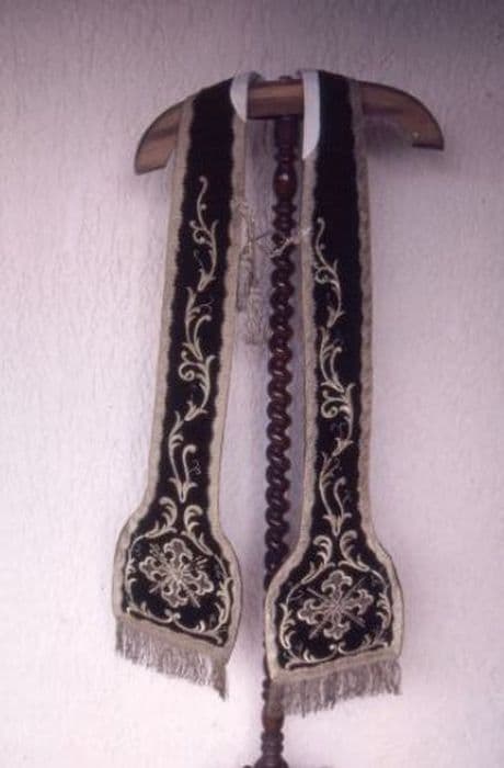 Etole pastorale en velours noir brodée d'une croix grecque enhendée et de rinceaux de soie d'or. Gland et franges argentés. Doublure noire.