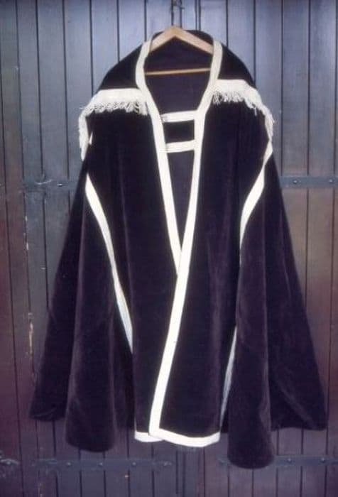 Chape en velours "tête de nègre". Orfrois et dosseret dessinés par passementerie de coton blanc. Doublure noire.