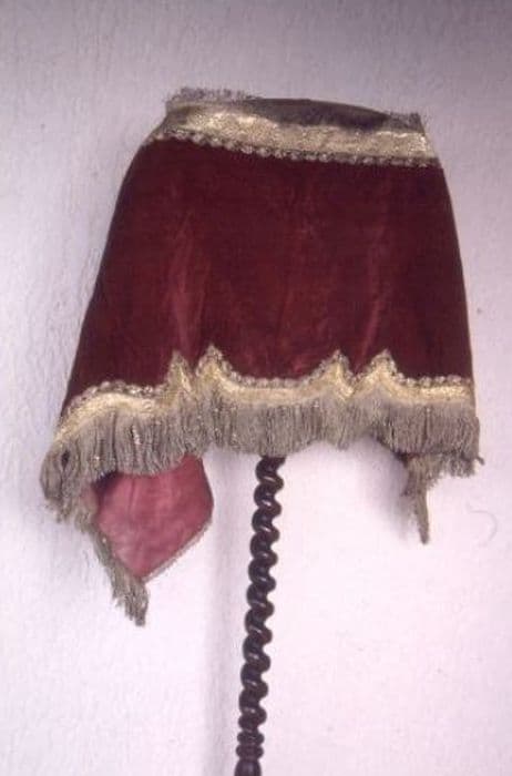 Petit devant d'autel en velours rouge cramoisi, avec franges dorées et doublure vieux rose.