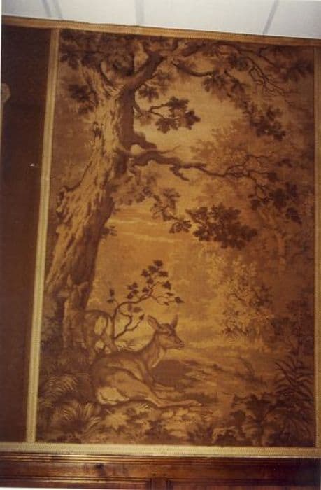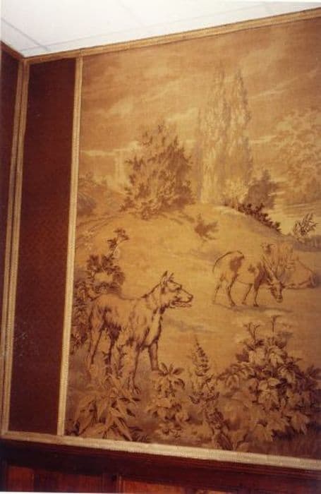 six pièces murales : Scènes de chasseurs, Sanglier, Héron, Biche au repos, Loup et cerf et Fête villageoise