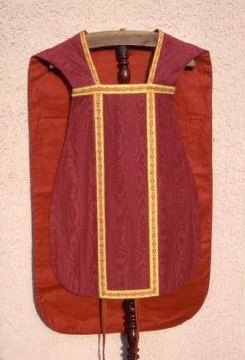 Chasuble en moire rouge. Orfroi et croix dessinés par passementerie droite jaune, chargée de losanges rouges à quatre points équipolés rouges. Doublure coq de roche.