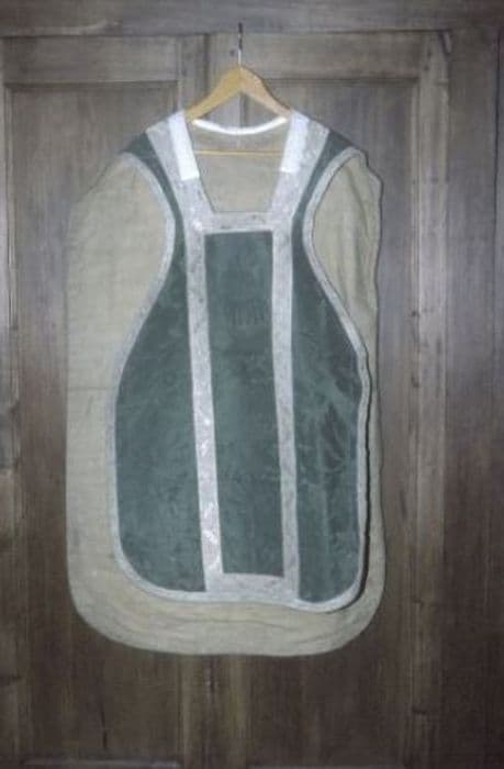 Chasuble en damas vert. Orfroi et croix à redents dessinés par une passementerie droite à la feuille de chêne et à la grappe de raisin d'argent, encadrant un damas vert à décor symétrique. Doublure mastic. Etole, manipule de forme tridentine et voile de calice en damas vert assortis à la chasuble.