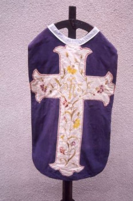 Chasuble en reps violet profond. Orfroi et croix ancrée en damas ivoire, à motif de croix de feuillage et croisette dans des quadrilobes brodés d'oeillets au naturel, tigés et feuillés de vert. Au centre de la croix : IHS gothique brodé en soie jaune. oublure bouton d'or