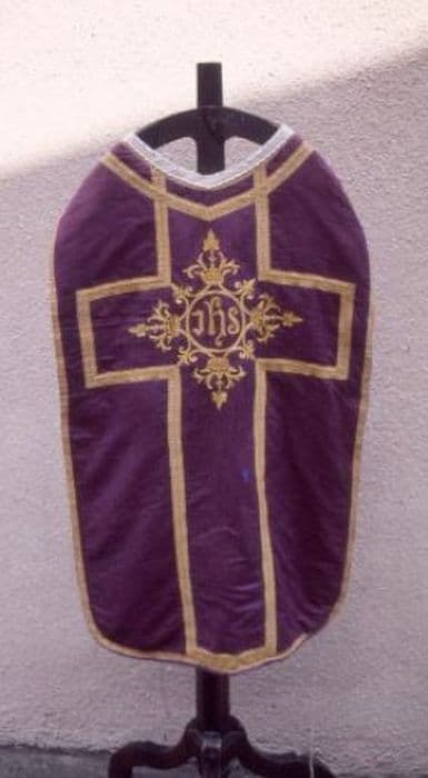 Chasuble en damas violet à motif de deux types de croix feuillées dans quadrilobe, un grand et un petit. Orfroi et croix dessinés par passementerie droite dorée de feuilles stylisées en guirlande. Croix chargée en coeur d'une broderie mécanique dorée représentant le monogramme du Christ en lettres gothiques dans un ovale entouré des quatre bras d'une croix grecque formée par des rinceaux enserrés dans une couronne (orfroi rapiécé). Doublure violette. Bourse en damas violet assorti à la chasuble.