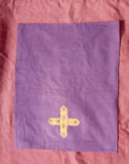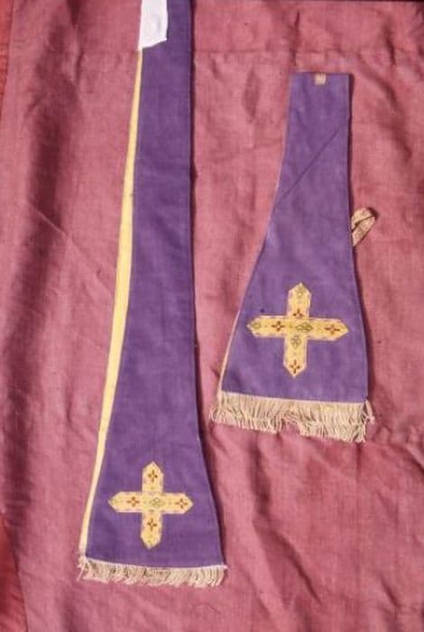 Etole et manipule en reps violet, de forme triangulaire. Croix aiguisée de passementerie jaune chargée de croisettes rouges et de losange formés par quatre macles vert amande. Tissu bordé de billettes mauves. Franges de coton mastic. Doublure bouton d'or.