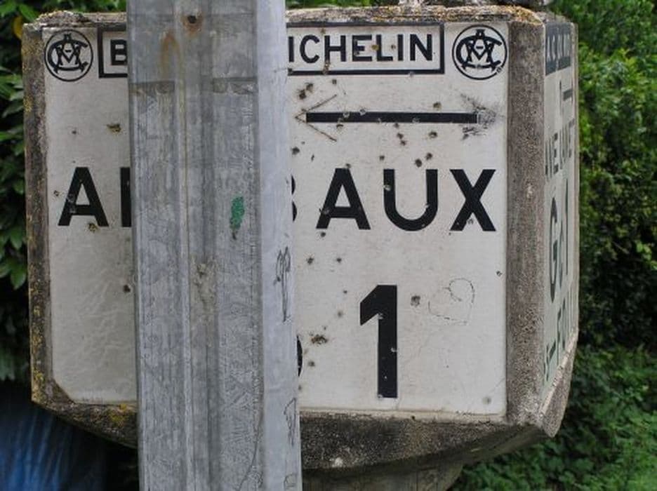 Borne Michelin en ciment et émail sur pied circulaire conique sommé d'une pyramide.
