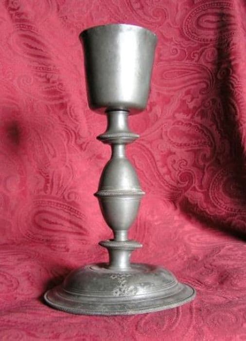 Pied rond bordé de stries, dessus bombé orné d’une croix formée par des ronds frappés. Collerette basse striée et collerette haute lisse. Noeud elliptique en hauteur, renflé au centre. Coupe évasée.