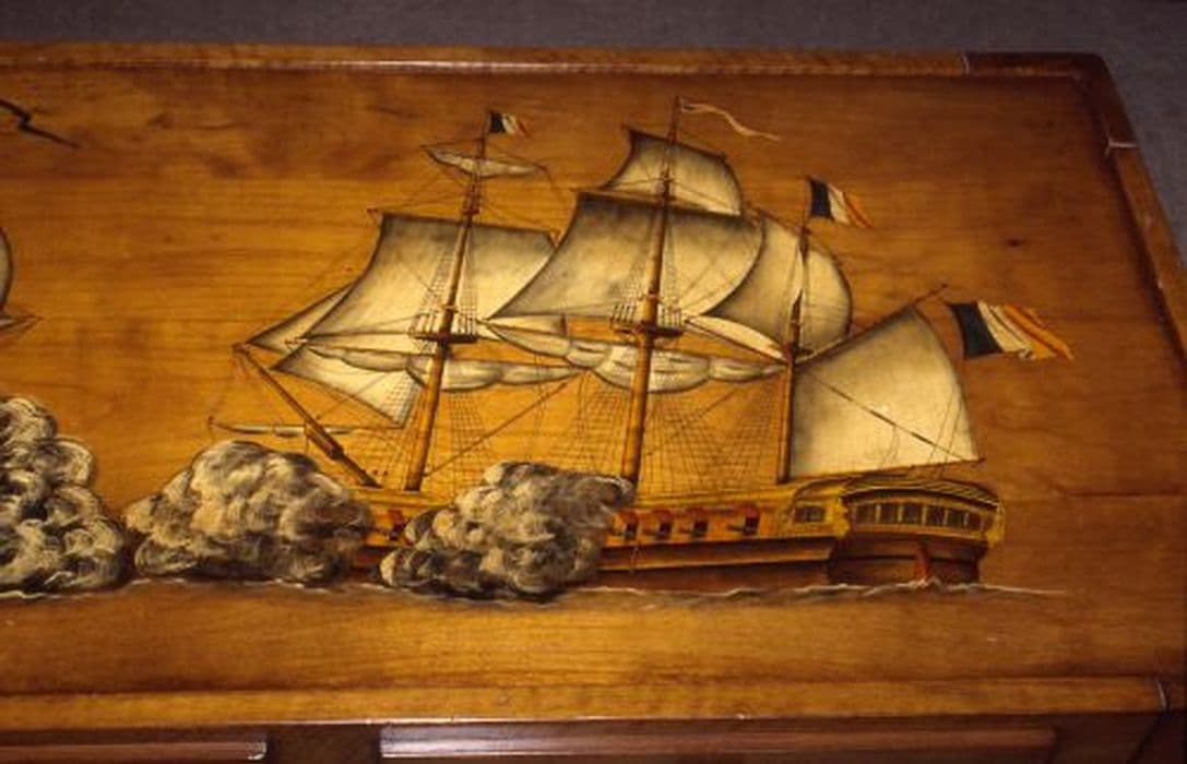 La scène peinte représente un combat naval entre deux vaisseaux du 18e siècle, l’un français, l’autre indéterminé.