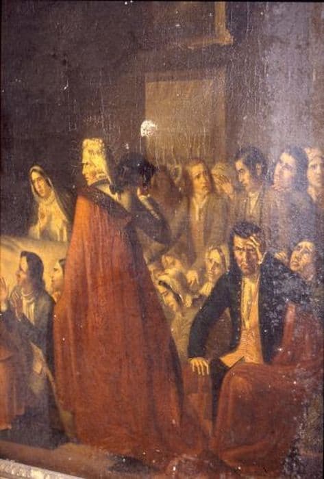 Le tableau représente la mort de l'abbé de l'hôpital. Il est allongé sur un lit, entouré d'une multitude de personnages.
