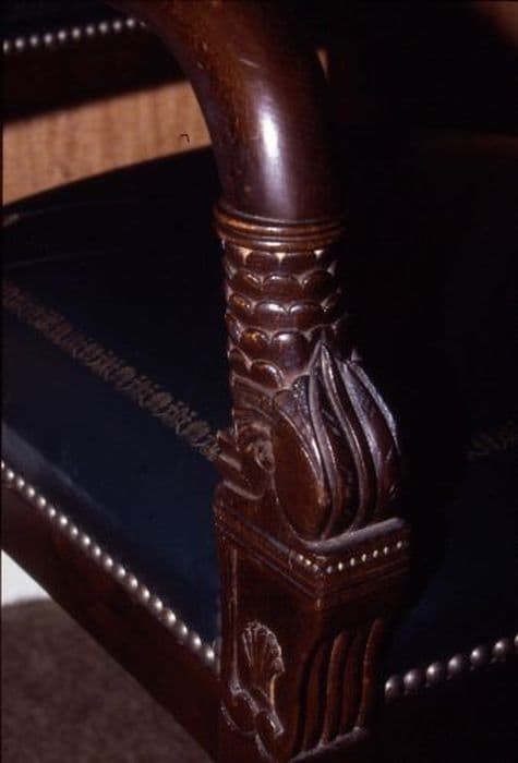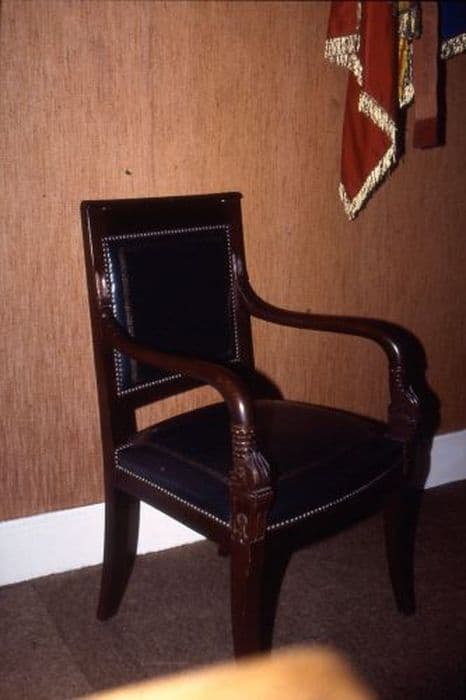 Fauteuil en bois style Directoire, à dosseret carré, tapissé de moleskine verte.