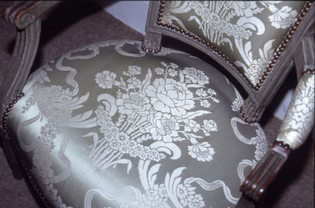 Fauteuils de style Louis XVI en bois blanc recouvert de tissu vert broché de fleurs et de feuillages blancs.