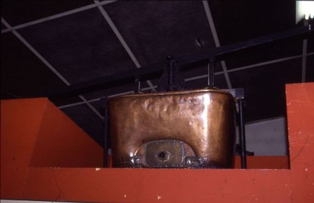 Pompe à bras, cuve en cuivre ; tuyaux en cuir rivetés.