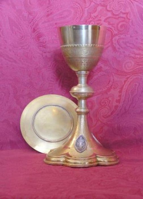 Calice et patène en métal doré dans un coffret parallélépipédique noir tapissé intérieurement de velours rouge. Calice sur pied sextilobe, bordure unie encadrée par deux rubans de filets perlés. Dessus conique guilloché, surmonté d’un anneau de rinceaux végétaux encadré par deux double cercles unis, le tout frappé de trois mandorles en métal blanc, entourées de perles. Fût fleurdelysé. Collerette basse unie. Noeud circulaire plat, perlé au niveau central, entouré de part et d’autre d’un décor fleurdelysé. Fausse coupe fleurdelysée surmontée d’un anneau de rinceaux végétaux. Coupe en forme de tulipe.