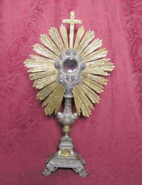 Ostensoir en argent, rayons et croix dorés. Pieds à volute baroque. Base rectangulaire ornée et dessus trapézoïdal chargés de scènes. Petite base supérieure rectangulaire décorée d’oves horizontales et de perles alternées, surmonté d’un décor végétal et de palmettes. Noeud en forme d’urne, orné sur la partie basse d'un décor feuillé, et sur la partie ventrue d'un médaillon baroque orné de grappes sur le devant et d’épis de blé au dos, encadré en chef de deux têtes d’anges. Fût supérieur cannelé orné de sarments de vigne en relief frappés au milieu d’une fine collerette striée en biais. Gloire, base décorée de feuilles de vigne et d’épis de blé, pourtour nuageux chargé de six têtes d’anges : deux en chef, deux en pointe, une de chaque côté. Entourage de la lunule doré et perlé. Rayons droits dorés. Croix végétale.