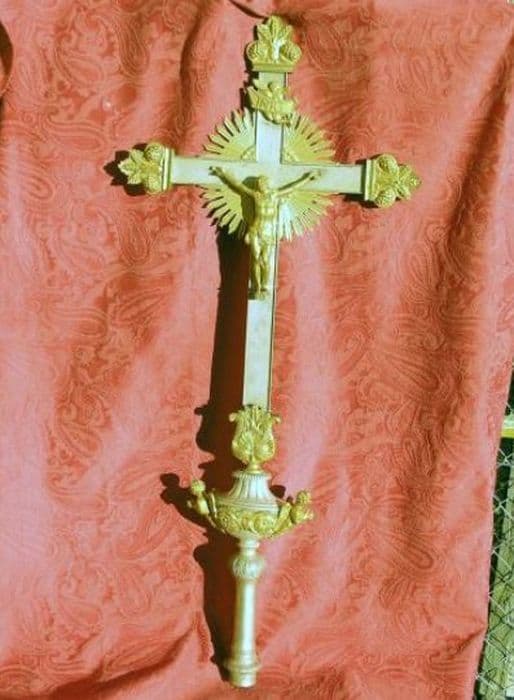 Croix processionnelle en maillechort avec apport de pièces en bronze doré. Base de la hampe conique. Fût avec cinq collerettes décorées de rosaces gravées entre deux rubans se croisant entre elles et, de part et d’autre, un ruban de feuilles de vigne et de grappes de raisin. Collerette identique à la base de la croix, légèrement conique terminé en forme d’urne inversée avec décor végétal sur la partie ventrue et collerette striée au sommet. Support de la croix évasé et aplati, décoré au centre des coeurs de Jésus et de Marie enflammés, encadrés de deux volutes frappées en coeur d’une fleur à huit lobes et cantonnés de deux anges en prière, les cheveux bouclés, le tout en bronze doré ; la partie haute en pyramide arrondie cannelée en creux et sommé d’une collerette godronnée. Base de la croix en bronze doré orné d’une feuille de vigne derrière laquelle émergent des épis de blé. Croix en métal argenté, rayonnante de bronze rapporté, les traverses et le sommet terminés par un motif formé de trois épis de blé cantonnés à la base de deux grappes de raisin, le tout en relief.