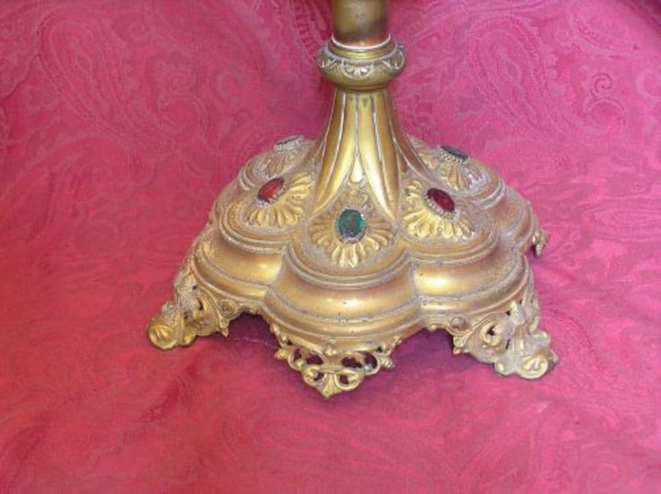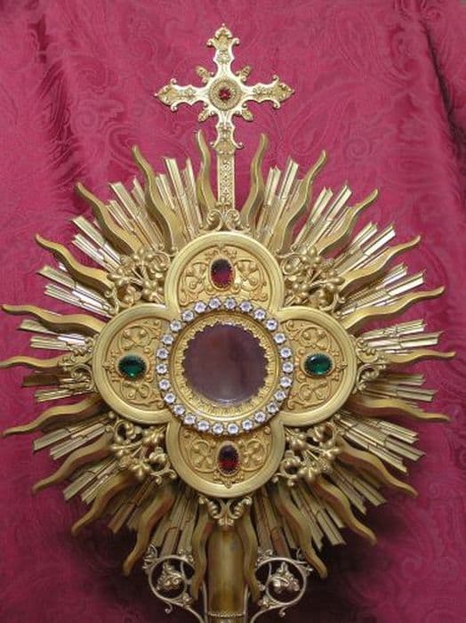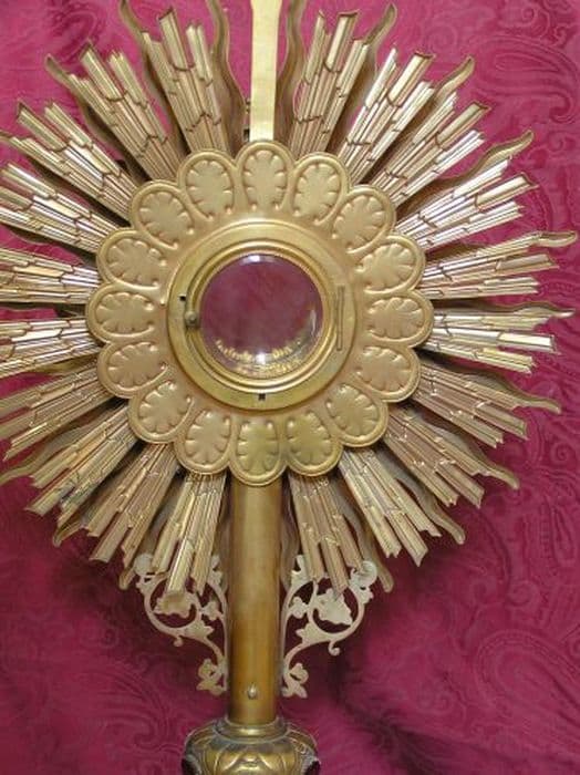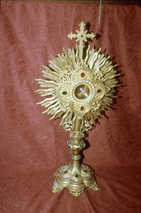 Ostensoir néo-gothique doré. Base à six pieds à décor végétal, dessus à la bordure nervurée et six jours ronds chargés d’une fleurette colorée. Collerette basse. Noeud à bossette avec six pierres colorées. Entourage de la monstrance en forme de croix grecque arrondie, frappée de quatre cabochons : deux rouges et deux verts. Gloire double : rayons droits et rayons flammés. Croix supérieure tridentée.