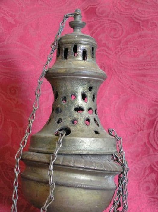 Encensoir en laiton argenté. Pied uni rond. Cuve unie. Cheminée à la bordure festonnée, redent percé d’orifices circulaires, redent supérieur uni. Chapeau rond percé de languettes ovales.